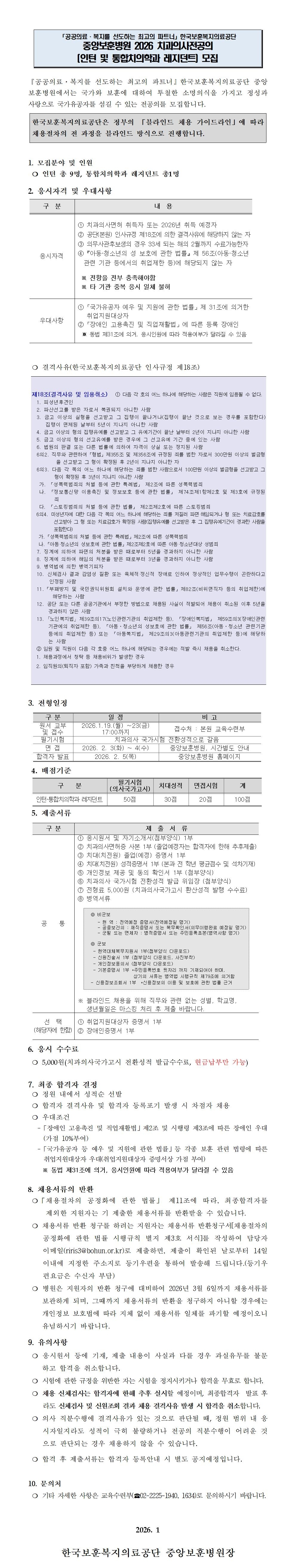 [중앙보훈병원]2026년 치과의사전공의(인턴 및 통합치의학과 레지던트)모집