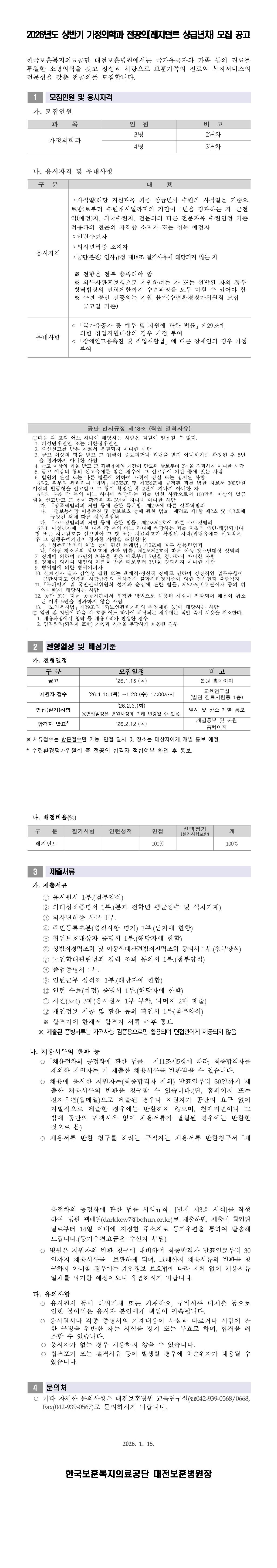 [대전보훈병원] 2026년도 상반기 가정의학과 전공의(레지던트 상급년차) 모집 공고