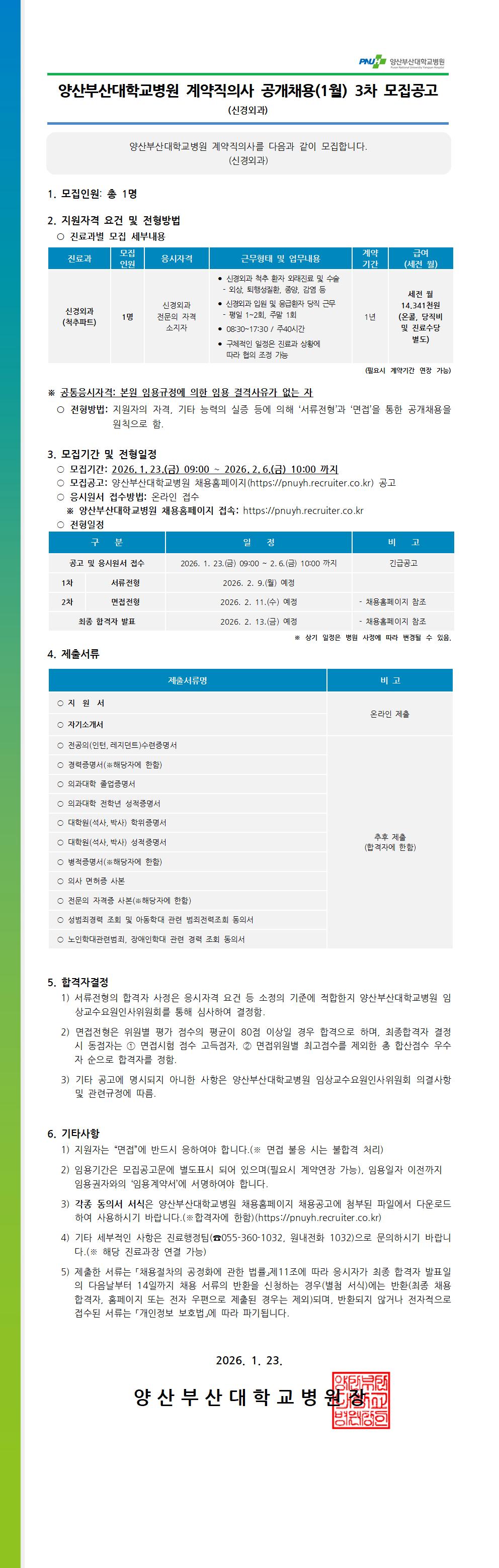 양산부산대학교병원 계약직의사(신경외과) 공개채용(1월) 3차 모집 공고